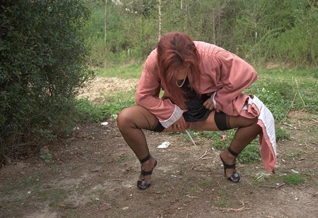 The red-haired woman likes to pee when she's watched